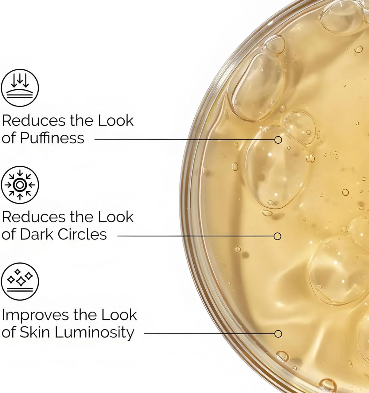 - Bénéfices : Réduit les cernes et poches, diminue la pigmentation, raffermit et décongestionne le contour des yeux, effet antioxydant
